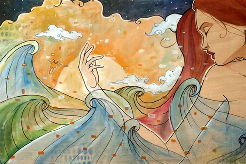 Lately I’ve been working pretty organically—meaning I’ll get an idea, and just go for it with minimal or no sketching … unless it’s a commissioned piece. Then I will do a detailed sketch first. But it’s been pretty liberating to just paint and draw and see what happens. I’ve been really interested in lots of layering and textures underneath the subject matter. It is appealing to the eye, both close and from a distance. Even if it’s just the pencil lines or the start of the painting that I didn’t like and lightly painted over, it creates an interesting depth to the piece.